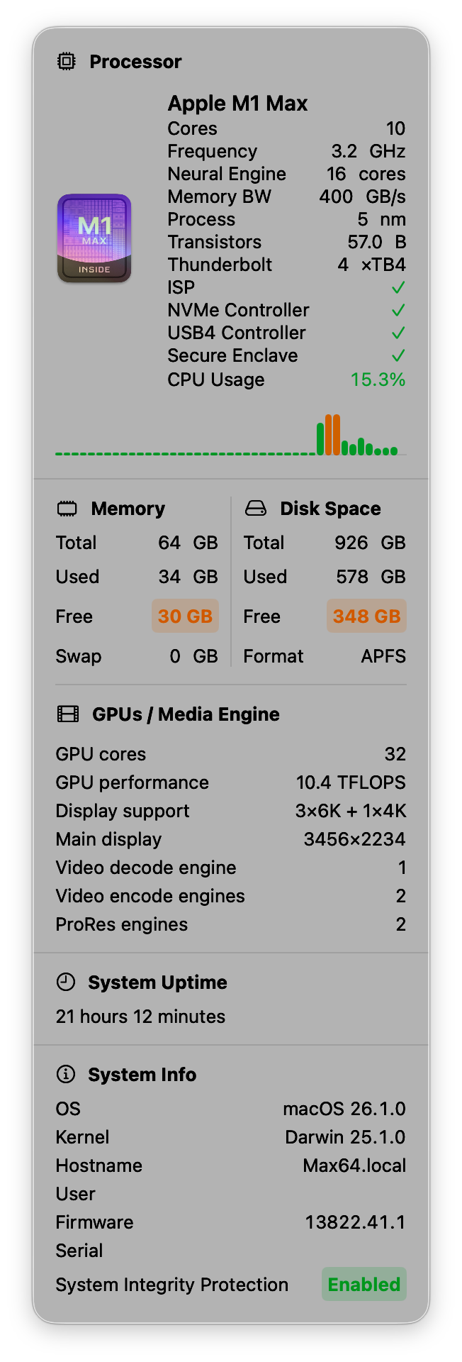 macOS Tahoe introduced an unexpected bug that caused the System Stats View to load slowly. We’re happy to report that this is now completely fixed—the launch is super fast again! The System Stats panel continues to provide detailed metrics, including full support for the latest Apple M5 processor (SoC) series statistics.